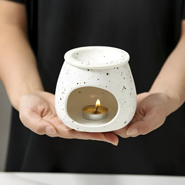 Transform any room into a tranquil retreat with this beautifully crafted ceramic aroma burner. Featuring a stylish white spotted glaze, this elegant burner doubles as a candle holder and essential oil diffuser, perfect for adding a warm, inviting fragrance to your home. Its sleek design complements any decor, making it an ideal centerpiece for your living room, yoga space, or special occasions like engagements.